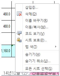 시트에 마우스 커서를 대고 마우스 오르쪽을 클릭하면 메뉴가 나오는데