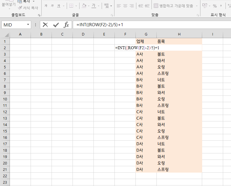 표에서는 5개 열마다 업체가 바뀌므로 굵은색으로 표시된 부분을 반복하고자하는 개수를 넣어주면 끝