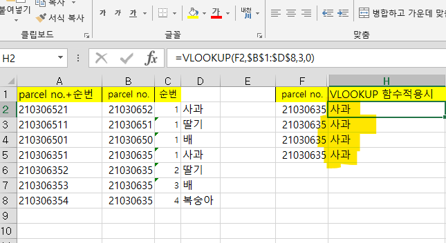 수식 "=VLOOKUP(F2,$B$1:$D$8,3,0)" -> 사과만 나온다.